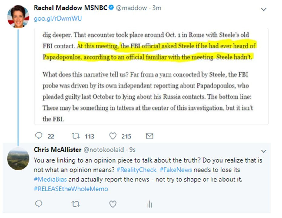 A so-called journalist linked to an opinion piece and tried to push it as definitive proof. If there is corruption in the DOJ and the FBI - then get rid of it. As I told one person I interacted with on Twitter -