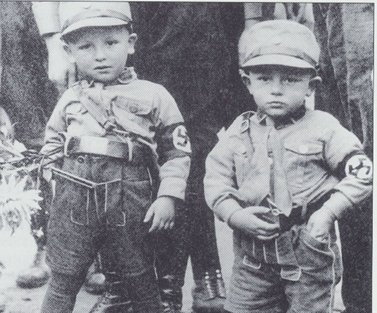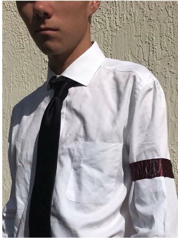 The arm band is also a Nazi symbol. Look closer at the picture on the left. White dress shirt, black tie, and black arm band.