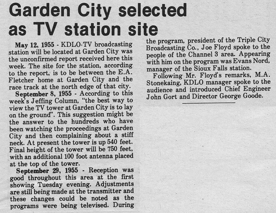 KDLO-TV was born in 1955, on an open field in a small town called Garden City....15 miles from Clark. An incredibly tall tower was erected, as altitude is was everything for the now archaic transmission science of 'line of sight'. A working studio and small office was built beneath the tower, which could be seen for miles over the flat plaines of this mid-west prairie.